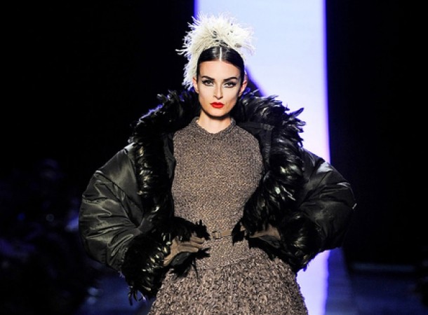Gaultier s-a inspirat din balet si din estetica filmului "Black Swan", cu pene inchise si