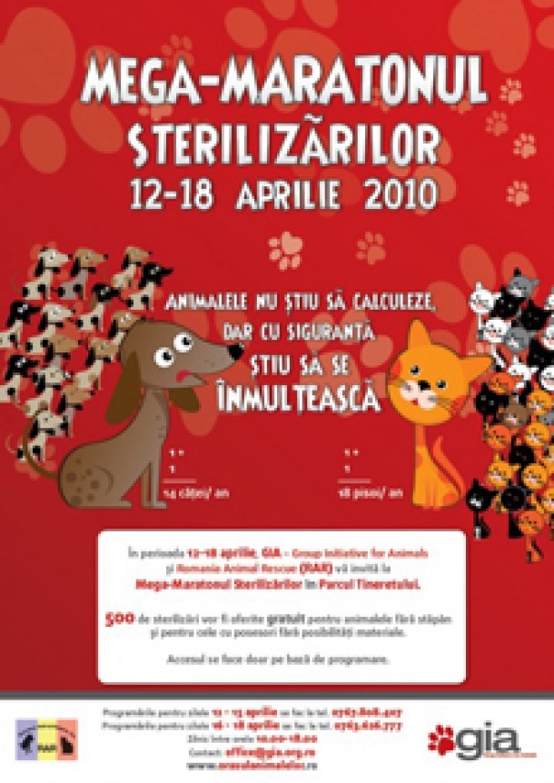 Acest program doreste sa contribuie la stoparea inmultirii animalelor fara stapan pe strazile orasului nostru: 500 de femele nesterilizate pot da nastere la peste 20.000 de caini in numai 5 ani. Pentru ca multe animale provin si din caini / pisici cu stapan, Asociatiile GIA si RAR ofera ocazia si proprietarilor sa isi sterilizeze gratuit animalele.