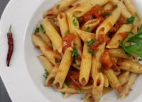 sare, 340 g penne, 1/4 ceașcă ulei de măsline extravirgin, 2 vinete mici, piper, 5 căței usturoi, 1 conservă roșii în bulion, 1/2 linguriță oregano, 1/2 ceașcă brânză ricotta, 1/2 ceașcă frunze busuioc proaspăt