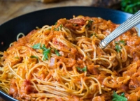 4. Se scurg spaghetele de apă și se adaugă în cratița cu sos, pentru a se combina, iar la sfârșit de presară parmesan ras.