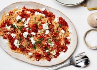 1/8 linguriță fulgi de ardei, 1/4 cană parmesan ras, 1/4 ceașcă măsline, 1/3 ceașcă pătrunjel, 1 lingură pastă de anchoa, 1 linguriță oregano uscat, 1 conservă roșii feliate nesărate, 1 lingură ulei de măsline extravirgin, 2 căței usturoi, 2 linguri capere, 3/4 ceașcă rucola, 300 g spaghete
