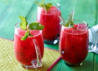 1. Se taie pepenele roșu pe rotund, în felii groase de câte 5 cm, astfel încât să obții 8 felii (dacă este nevoie se mai ia un pepene), apoi se stoarce toată zeama din bucățile de lime.