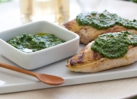 500 g piept de pui, 155 g spanac, 90 g brânză feta, piper negru, sare de mare, 2 linguri ulei de măsline extra-virgin, câteva căpșuni, 2 linguri sirop de agave, 1 lingură oțet roșu, nuci pecan