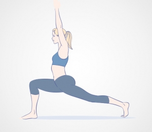 După ce ai respirat de câteva ori complet în timp ce ai stat în poziţia de yoga de mai sus, fixează-ţi piciorul din faţă cât mai ferm pe podea şi ridică-ţi trunchiul, ridicând ambele braţe deasupra capului, dar menţinând umerii jos. Braţele trebuie să îţi treacă pe lângă urechi. Ridică-ţi trunchiul şi apleacă-ţi coapsele, către înainte. Respiră complet de câteva ori, apoi repetă poziţiile 2 şi 4, cu celălalt picior în faţa ta.