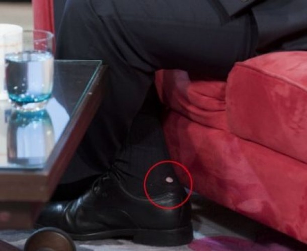 Invitat la o emisiune tv, premierul David Cameron a fost filmat cu o gaura in soseta dreapta.