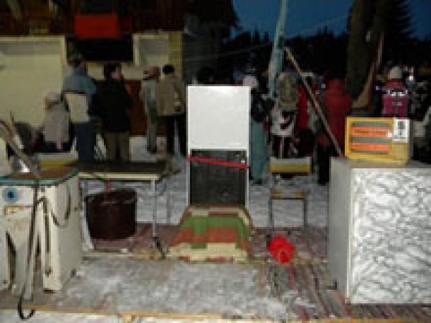 Proprietarii trasnitului vehicul s-au gandit sa ironizeze programul guvernamental. "Am asezat pe schiuri o placa pe care am pus obiecte dintr-o casa tipic romaneasca. Frigiderul este gol, televizorul e stricat, aragazul nu functioneaza nici el si am pus presuri romanesti tesute de stramosi", a precizat Samuel Demes, liderul echipei.