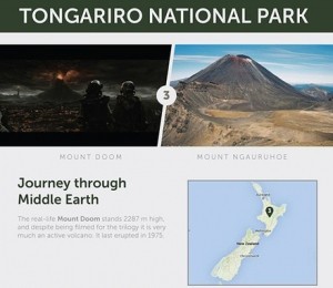Calatoria prin tinutul Middle Earth include Comitatul unde locuiau Hobbitii, iar in realitate peisajele pitoresti au fost inspirate din zona Matamata din Noua Zeelanda. Tinutul Rivendell este, de fapt, Parcul Regional Kaitoke. Mount Doom este Muntele Ngauruhoe. Infografic creat de cheapflights.com.au. Sursa.