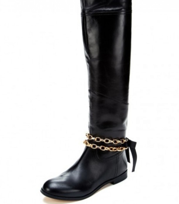 Ai nevoie de: o panglica din piele si un lant auriu, cizme negre simple.
