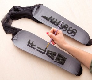 Ai nevoie de: un dres negru 20 den, un marker textil negru, doua cartoane de 10 cm, foarfeca.