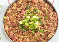 2. Se încinge uleiul într-o tigaie mare neaderentă, pe foc mediu, se adaugă ceapa tocată și se amestecă frecvent timp de 5-7 minute, apoi se pune usturoiul tocat, chimenul, zeama de lămâie, 3/4 linguriță sare și puțin piper, după care se amestecă un minut și se adaugă 1/2 cană apă.