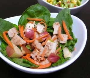 Se fierbe pieptul de pui pana devine fraged. Cu 10 -15 minute inainte ca acesta sa fie gata, se adauga merele. Se serveste cu salata de cruditati. Merele sunt o alternativa mai saraca in calorii la cartofi, paste sau orez.