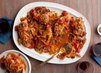 1/2 ceapă roșie, 1 ceașcă mozzarella rasă, 1 linguriță ierburi italienești, 1 dovlecel zucchini, 2 linguri ulei de măsline extravirgin, 2 ardei grași galbeni, 3 roșii medii, 4 piepți de pui fără pieliță și os, sare, piper negru măcinat