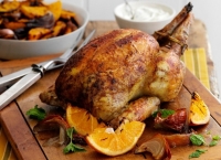 3. Se pun în crestăturile de la pui jumătăți de feliuțe subțiri de dovlecel, roșii tăiate felii foarte subțiri, ardei gras spălat și curățat tăiat subțire și rondele de ceapă roșie.