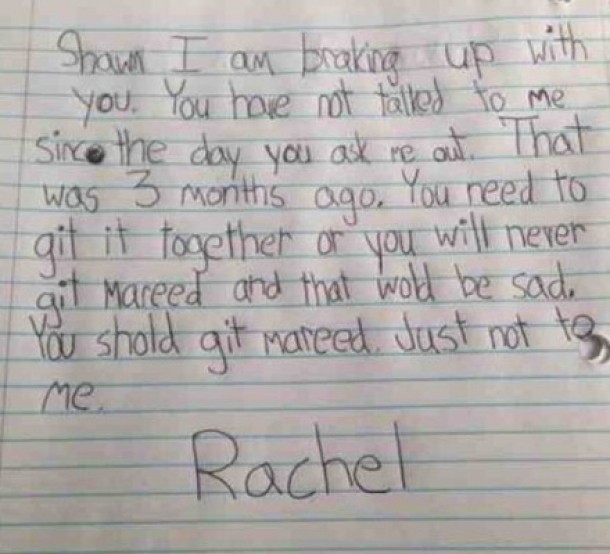“Shawn, ma despart de tine. Nu ai mai vorbit cu mine din ziua in care m-ai invitat in oras. Asta s-a intamplat in urma cu 3 luni. Trebui sa te aduni altfel nu te vei casatori niciodata si asta ar fi trist. Ar trebui sa te insori. Dar nu cu mine.