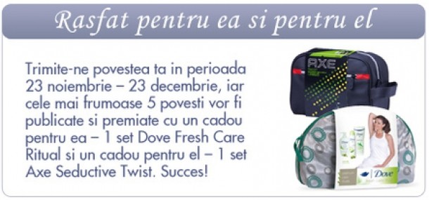 Trimite-ne povestea ta in perioada 23 noiembrie – 23 decembrie, iar cele mai frumoase 5 povesti vor fi publicate si premiate cu un cadou pentru ea – 1 set Dove Fresh Care Ritual si un cadou pentru el – 1 set Axe Seductive Twist. Asteptam povestea ta la adresa de e-mail [email protected]