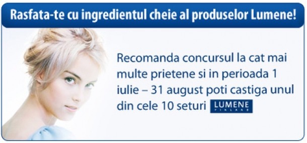 Recomanda concursul prietenelor tale si poti castiga unul din cele 10 seturi Lumene. Fiecare set contine Lotiune tonica Sensitive Touch, Crema de noapte Sensitive Drops si Crema exfolianta Arctic Touch.