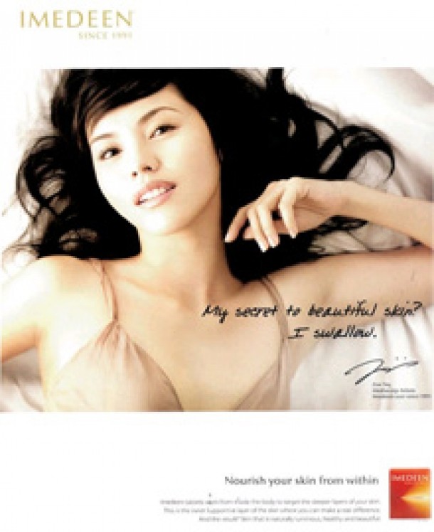 Ca sa nu mai lungesc misterul, este vorba de o campanie publicitara asiatica ce promoveaza pastila de albire a pielii – Imedden. Campania pune in prim plan o femeie de origine asiatica, cu o piele foarte alba, iar textul de impact este “Secretul frumusetii mele? Inghit.”