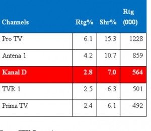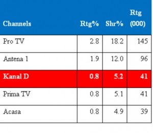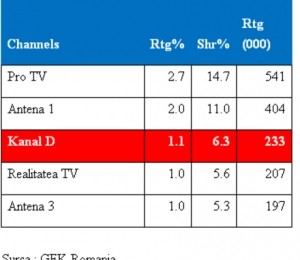 De asemenea, Kanal D s-a situat pe locul al treilea, dupa audienta si cota de piata, devansand posturi precum TVR, Prima TV, Antena3 sau Realitatea TV.