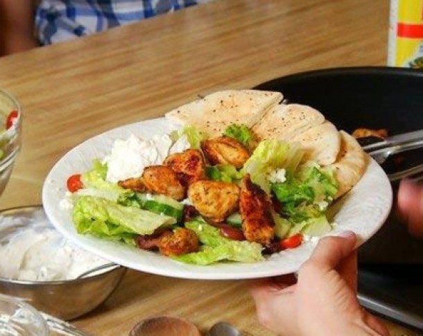 Ai nevoie de: o lingurita de oregano uscat, o jumatate de lingurita de praf de usturoi, 3 sferturi de lingurita de piper negru, o jumatate de lingurita de sare, ulei de masline, un piept de pui dezosat, 5 lingurite de zeama de lamaie, 1 ceasca de iaurt segresat, 2 lingurite de pasta de susan, 1 lingurita de usturoi pisat, 1 cana de salata tocata, 1 cana de rosii cherry taie pe jumatate, 6 masline Kalamata taiate pe jumatate, un sfert de branza feta pisata.