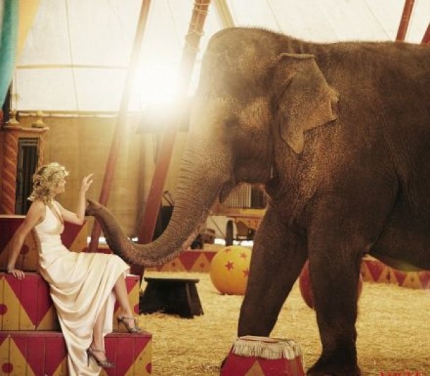 Reese apare in fotografii alaturi de un elefant, intrucat starul isi promoveaza noul sau film "Water For Elephants".