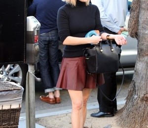 Reese Witherspoon a optat pentru o tinuta in tendinte, compusa dintr-o fusta scurta din piele, o maleta neagra, ghete negre cu toc si o geanta mare din piele.