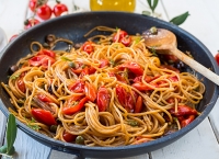 3. Se dă focul la mediu și se amestecă ocazional, până când sosul se îngroașă puțin, adică în jur de 15 minute, după care se asezonează după gust cu sare și piper, iar la sfârșit se adaugă busuiocul, se amestecă, se stinge focul și se mai lasă 5 minute, după care se servește peste paste, ca bază pe pizza sau cu chipsuri tortilla.