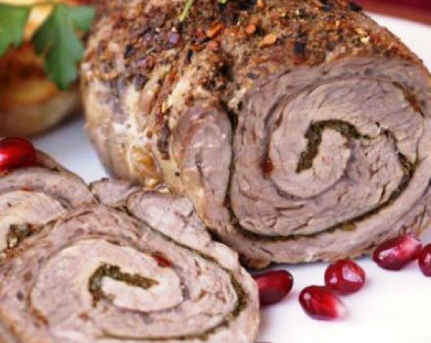 Taie antricotul in portii, bate-l bine cu ciocanul de snitele si da-l la sare. Spala carnea de porc, taie-o in bucati si toac-o la robot sau la masina de tocat. Pune sare, piper si ouale si amesteca bine. Umple cu aceasta compozitie antricotul si ruleaza-l. Asaza antricotul umplut intr-o tava unsa cu grasime si baga la cuptor pentru 25 de minute.