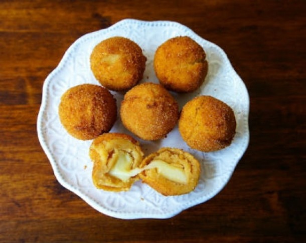 Formeaza din piureul obtinut 15 chiftele. In fiecare chiftea pune cate un cubulet de mozzarella. Rostogoleste chifteaua in pesmet, apoi in ou batut si apoi mai trece-o odata in pesmet si prajeste-o in tigata in care ai incins deja uleiul de floarea-soarelui.