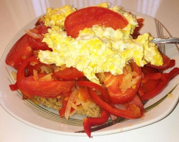 "Omleta cretana - dakos (paine uscata) de hrisca, rosii, ardei si ceapa trase la tigaie, oua de tara si feta rasa. Se adauga ulei de masline si se lasa 5 minute sa se inmoaie painea uscata in sosul de rosii.