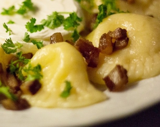 Se curata cartofii fierti si se dau prin razatoare, se amesteca cu ou si faina si se framanta aluatul. Se lasa apoi la dospit. Intre timp se toaca sunca, se pune la prajit si se marunteste ceapa verde. Aluatul obtinut se imparte in bucati mici egale si se intind cu facaletul. Cu o lingura se pune compozitia pregatita in centrul fiecarei bucati de aluat si se infasoara, avand grija ca marginile sa fie bine lipite apasand cu furculita. Se pun apoi la fiert in apa cu sare timp de 6 minute. Se servesc impreuna cu sunca prajita, tocata marunt, smantana si ceapa maruntita.