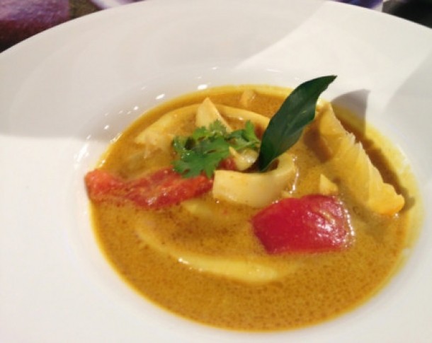 3. Se pun la incins 3 linguri ulei de masline, se adauga 2 catei de usturoi taiati in jumatate, ceapa maruntita, ghimbirul ras, laptele de cocos, curry-ul, zeama de lamaie, coriandrul maruntit, turmenicul, sarea si piperul (dupa gust).