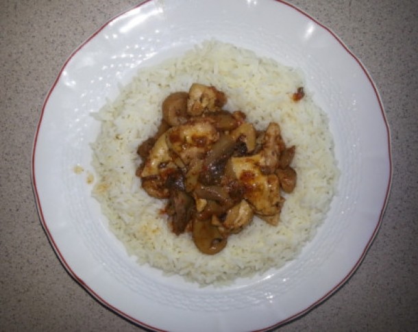 Cand a scazut apa de la puiul cu ciuperci, ridicati capacul si adaugati mararul, patrunjelul, piperul si sarea. Amestecati bine in timp ce turnati sucul de rosii. Acoperiti tigaia pentru inca 2 minute si lasati-o la foc mic, timp in care scoateti orezul de la fiert si il asezati in cerc pe o farfurie. In mijlocul cercului adaugati puiul cu legume si masa e gata. Pofta buna!