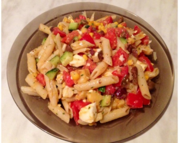 Se pun pastele la fiert timp de 15 minute. Alaturat, intr-un ibric, se pun si ouale la fiert timp de 7 minute. Intr-un castron mare se pun rosiile, castravetele, cascavalul si branza taiate cubulete. Peste acestea se adauga patrunjelul taiat, porumbul si maslinele. Dupa ce ouale s-au fiert si racit le decojim si le taiem in patru. Le adaugam in castron peste celelalte ingrediente. Ultimele adaugate sunt pastele. Apoi se condimenteaza cu sare si piper dupa gust. Adaugam si ulei si amestecam pana se incorporeaza bine.