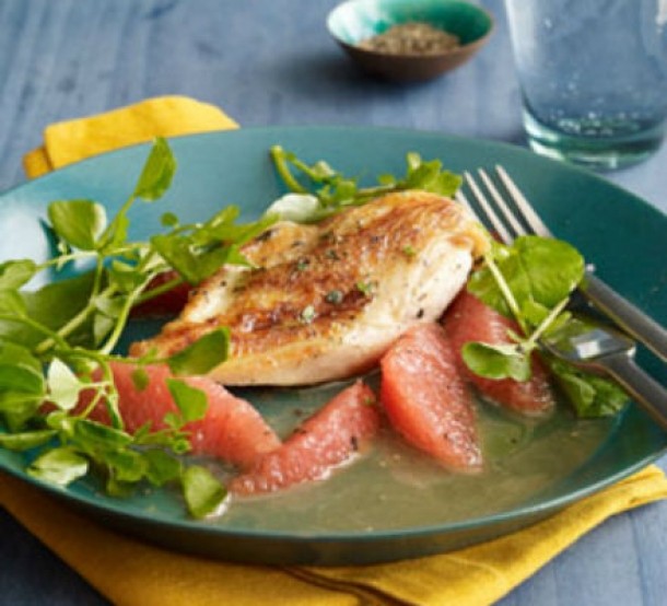 3. Asaza Nasturelul si feliile de grapefruit curatat pe farfurii, adauga bucatile de piept de pui si sosul.