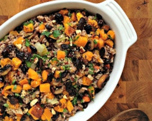 Intr-un bol se amesteca merele cu merisoarele, cu patrunjelul taiat marunt, cu cimbrul, cu cana de faina si cu condimentele. Acest amestec trebuie sa fie omogen si sa se puna la cuptor timp de 15 minute.