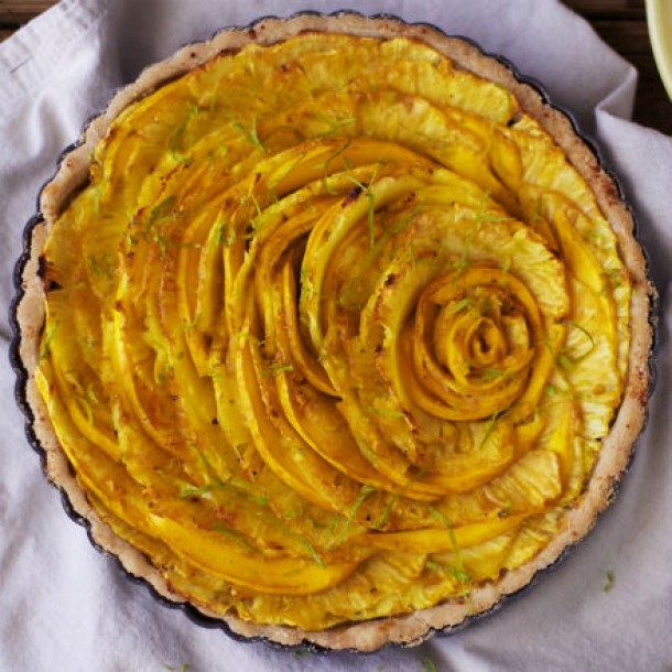 Incinge bine cuptorul. Ia crusta de la frigider si presara faina de migdale. Aranjeaza fructele in sens circular in interiorul creustei, pana se umple bune. Apoi, presara nuca de cocos. Coace timp de 35-40 de minute pana cand crusta devine autie si fructele sunt moi si caramelizate. Las-o sa se raceasca, tai-o felii si ...