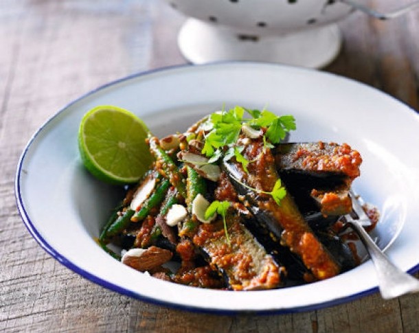 3. Tot in uleiul de nuca de cocos din tigaie gateste pasta de curry pentru aproximativ 3 minute. Adauga vinetele si ameste ca bine pana le acoperi cu pasta. Adauga piureul de rosii si laptele de cocos si lasa sa fiarba timp de 10 minute. Adauga fasolea verde si mai fierbe inca 6 minute la foc mediu.