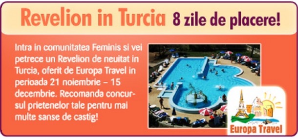 Feminis si Europa Travel te invita sa petreci de Revelion in Turcia, alaturi de persoana draga. Castigatoarea va fi aleasa prin tragere la sorti si anuntata pe site in data de 16 decembrie 2008. Aceasta este rugata sa isi revendice premiul in termen de o saptamana, in caz contrar premiul va merge catre o alta castigatoare.