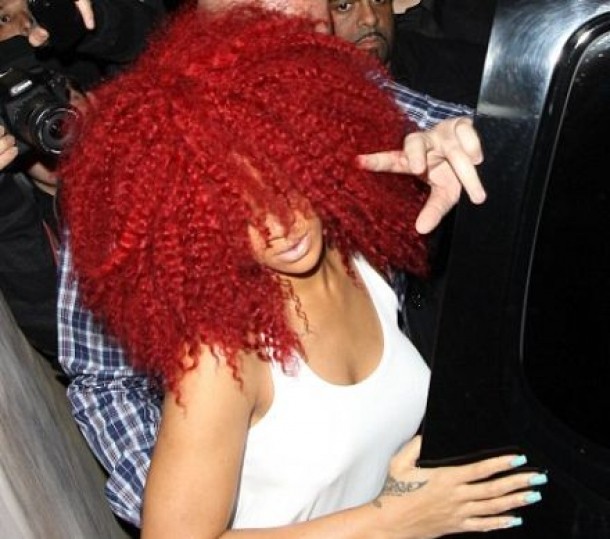 Rihanna, imbracata intr-o rochie lejera de culoare alba, a facut furori, purtandu-si parul rosu cu bucle si avand un volum imens.