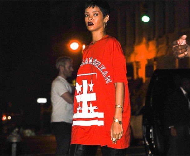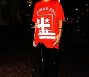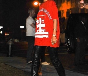 Rihanna, insa, a reusit sa combine un tricou rosu supradimensionat cu o pereche de cizme negre, Christian Louboutin, ce au luat locul pantalonilor, dand unei tinute sport un aer sofisticat.