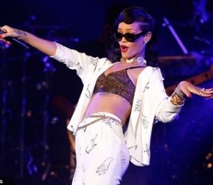 Sub costumul alb, Rihanna a purtat lenjerie intima cu animal print, pe care a dezvaluit-o prin gesturi menite sa incite.
