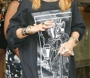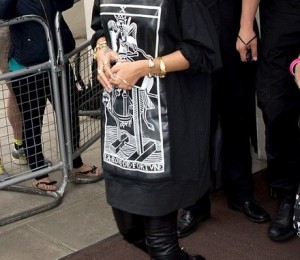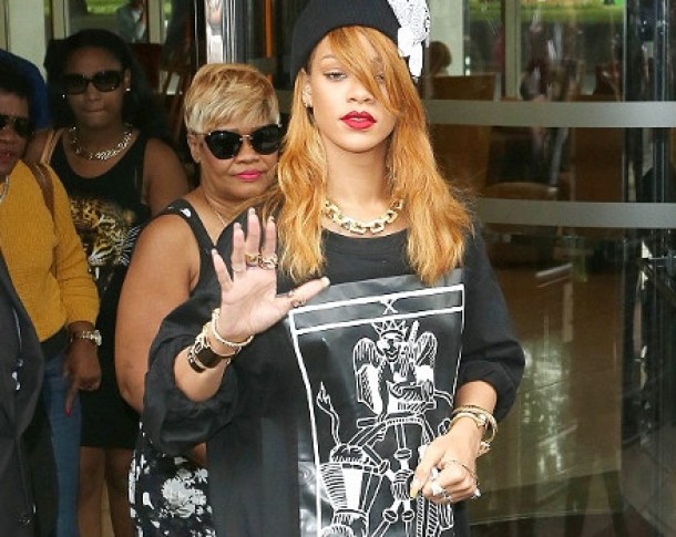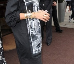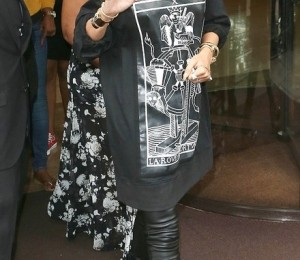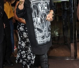 In ceea ce priveste accesoriile, Rihanna merge pe principiul cu cat mai mult, cu atat mai bine, asa ca a adaugat un plus de stralucire tinutei cu un lant supadimensionat, bratari si inele multiple.