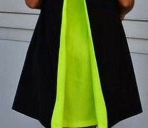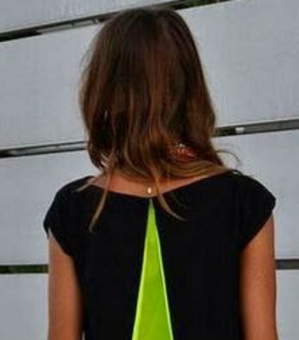 Cumpara un material intr-o culoare care sa contrasteze cu materialul rochiei. Taie apoi spatele rochiei exact pe jumatate si decupeaza materialul cumparat in forma de triunghi.