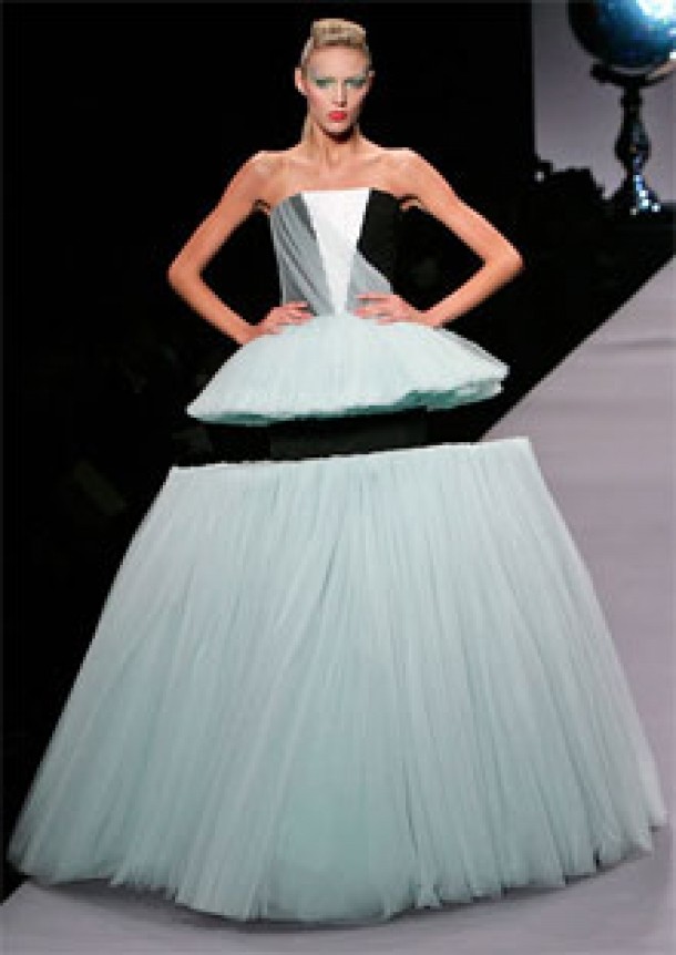 Inspirati din produsele “rontaite” au creat o rochie din tull, sectionand o parte din ea, creand un efect sculptural uluitor.