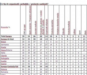 In Europa si SUA, procentul persoanelor care ofera bani anual este relativ asemanator, de 35%. Olandezii, britanicii si suedezii par a fi deosebit de generosi in aceasta privinta: doua treimi dintre locuitorii Olandei si jumatate din cei ai Marii Britanii si Suediei contribuie cu bani la cauze caritabile in fiecare an. Cu toate acestea, numarul celor care renunta la o parte din timpul lor pentru a sustine cauze nobile este mai mic in Romania decat in alte tari, de doar 2%.