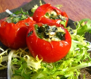 Se scoate miezul rosiilor. Intr-un castron se amesteca branza proaspata cu mararul si patrunjelul taiate marunt, cu o lingura de ulei si cu ceapa.Se taie cascavalul rondelute si se pune capacel la rosii. La fel si sunca presata.Se baga la cutor 15 minte, pana cand branza incepe sa se topeasca.