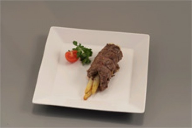 Ruleaza carnea si leag-o cu sfoara de bucatarie. Incinge untul intr-o cratita, rumeneste ruladele pe toate partile si introdu-le la cuptorul preincalzit la 150 de grade pentru circa 10-15 minute, pana cand carnea s-a fragezit complet.