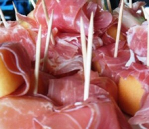 Se taie marunt pepenele galben sau se rade. Feliile de sunca se umplu cu branza feta si cu pepene galben. Se prind cu o scobitoare si se aseaza pe un platou. Separat se amesteca rosiile taiate cu nucile maruntite, cu zeama de lamaie si cu maslinele taiate marunt. Se adauga salata langa rulouri.