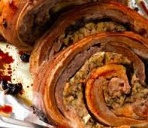 Se spala carnea de miel, se taie in 4 felii, care se bat usor cu ciocanul de snitele. Se ung cu unt topit, se presara cu mirodenii speciale pentru carne de miel (cimbru, oregano, nucsoara). Se face un amestec din ardei gras taiat feliute, ceapa taiata solzisori, morcovi taiati rondele, piure de spanac, ulei, vin, verdeata, sare si piper, dupa gust. Se asaza uniform acest amestec peste carnea de miel, pe toata suprafata, apoi se pune un strat cu feliute de rosii. In mijloc se asaza branza, in asa fel incat atunci cand se ruleaza, sa ramana in centru. Se ruleaza apoi felia de carne cu toate ingredientele in interior, formandu-se un rulou, bine strans, uniform, mai ales spre capete si se leaga cu ata. Se procedeaza la fel cu toate feliile de carne, se asaza rulourile intr-o tava, cu putina apa si vin, apoi se introduc la cuptor, la foc potrivit, cca 2 h. Dupa ce se racesc, se scot atele si se taie in felii de 3-4 cm.