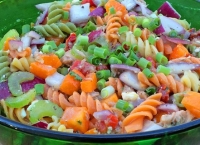 2. Într-un alt bol de mari dimensiuni vei amesteca toate celelalte ingrediente. După ce vei scoate pastele din frigider, le vei pune peste compoziţia din bol, amestecând bine.